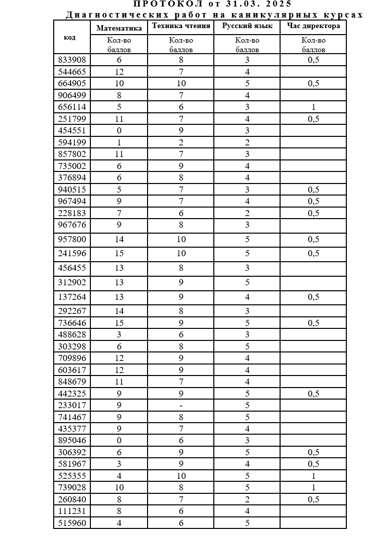 Уважаемые слушатели каникулярных курсов "Школа будущего пятиклассника", доводим до сведения итоговые результаты диагностичексих работ по математике, русскому языку, технике чтения согласно шифрам, которые находятся у вас.