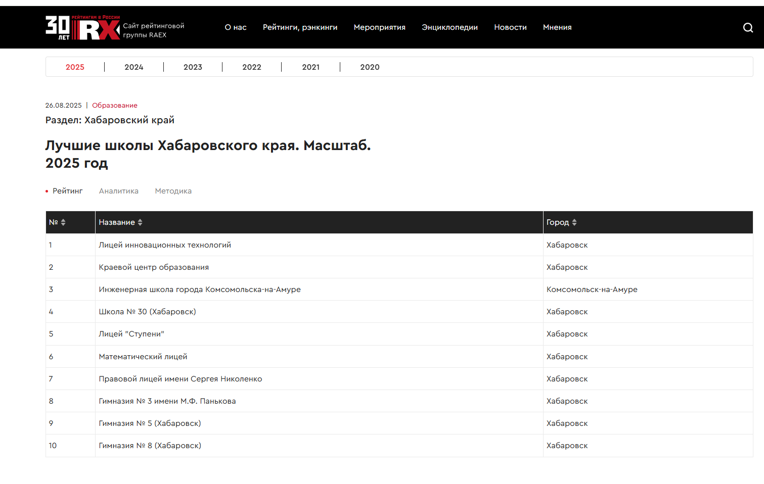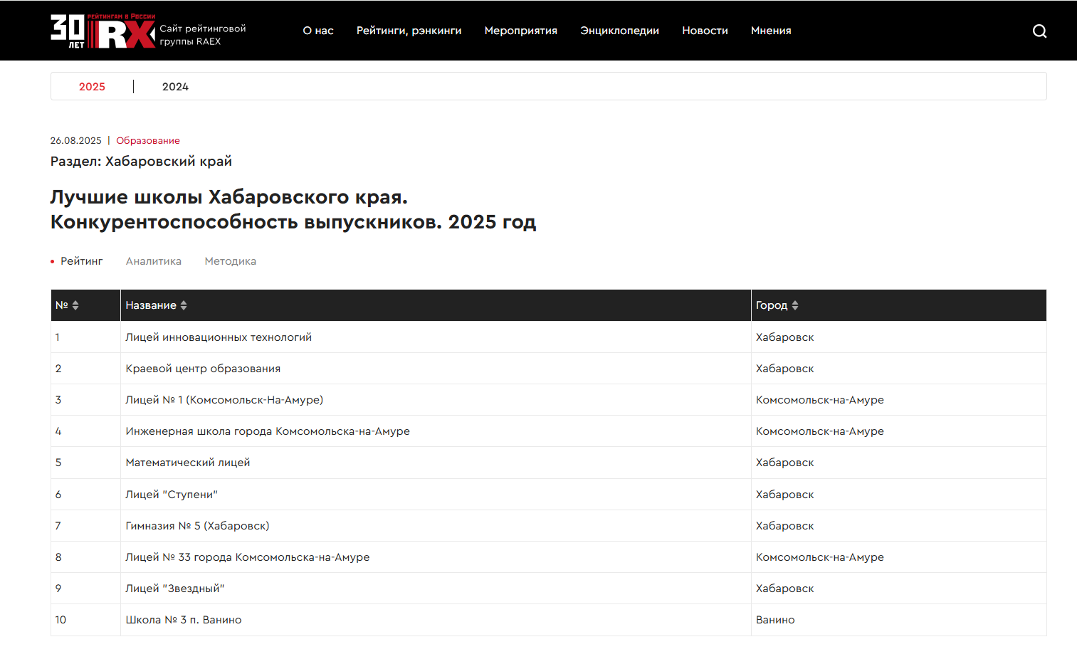 Известное агентство RAEX представило обновленный рейтинг лучших школ России, в котором вновь отличился «Лицей инновационных технологий». Лицей уверенно занял высокие позиции, продемонстрировав отличные показатели по числу выпускников, поступающих в престижные российские университеты.